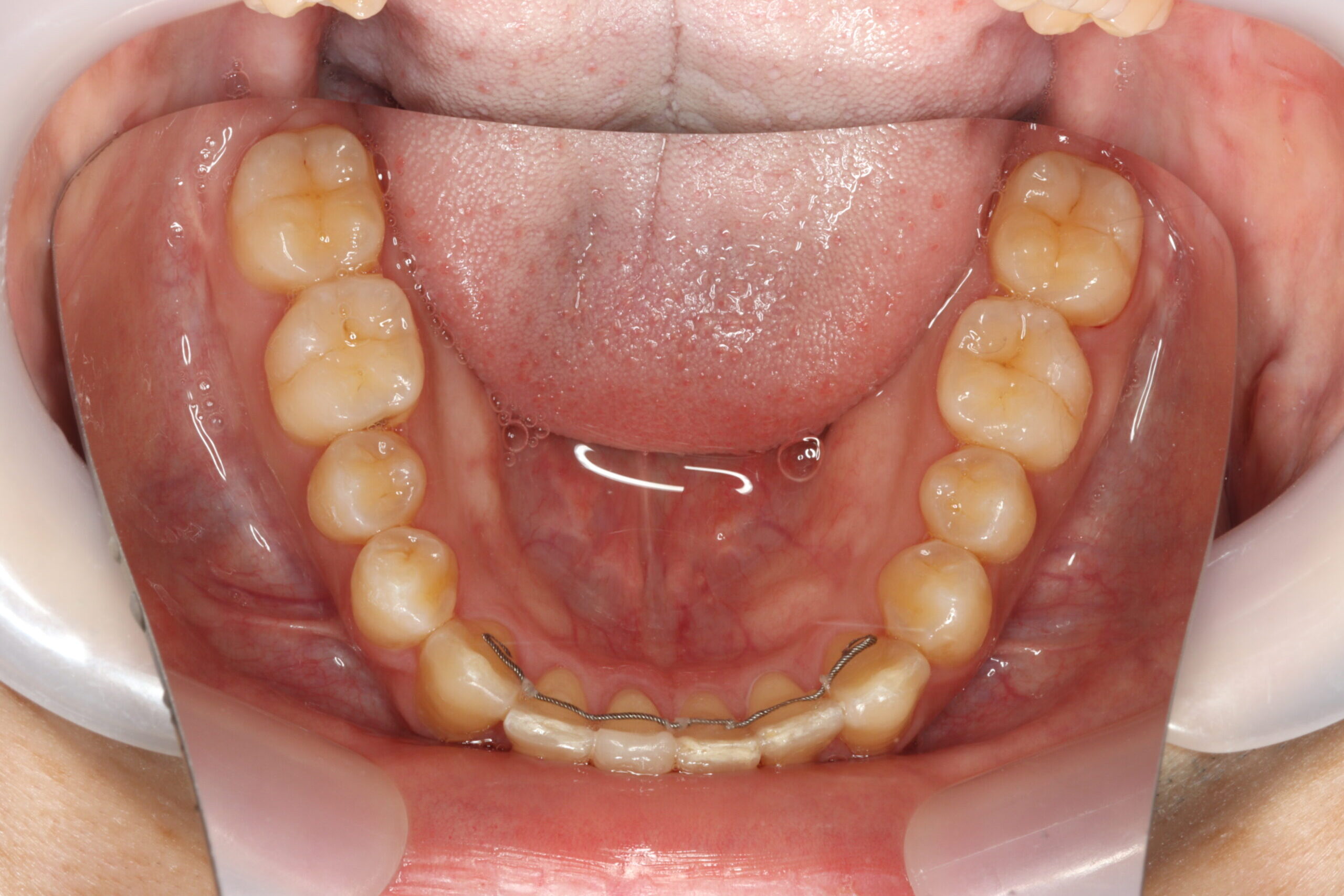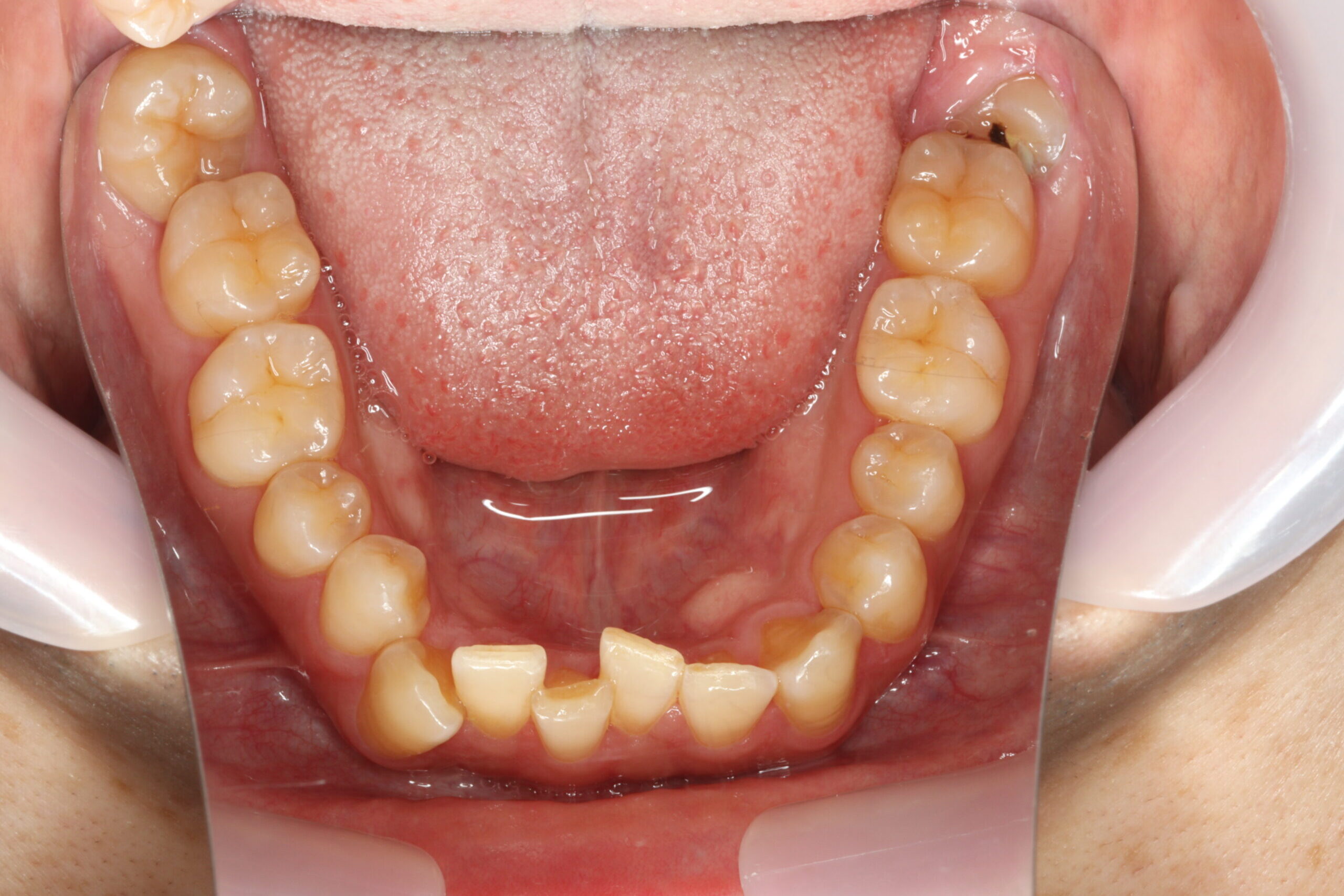 【診断】叢生(でこぼこ)、過蓋咬合、下顎前方位、Low angle、 上顎前歯軽度唇側傾斜、下顎前歯舌側傾斜