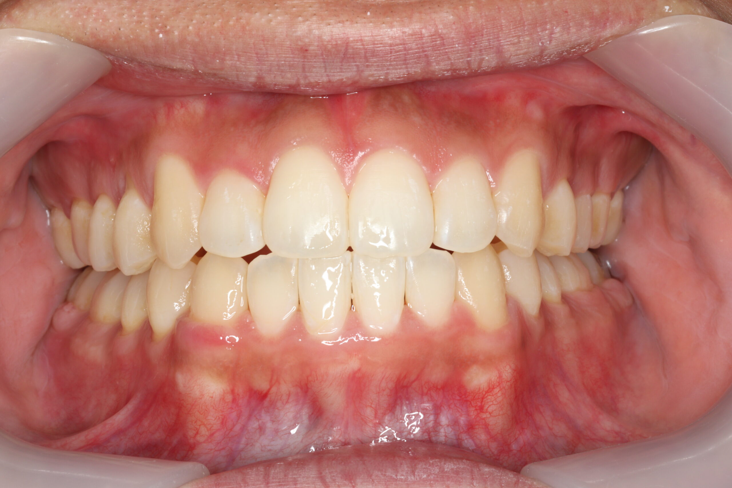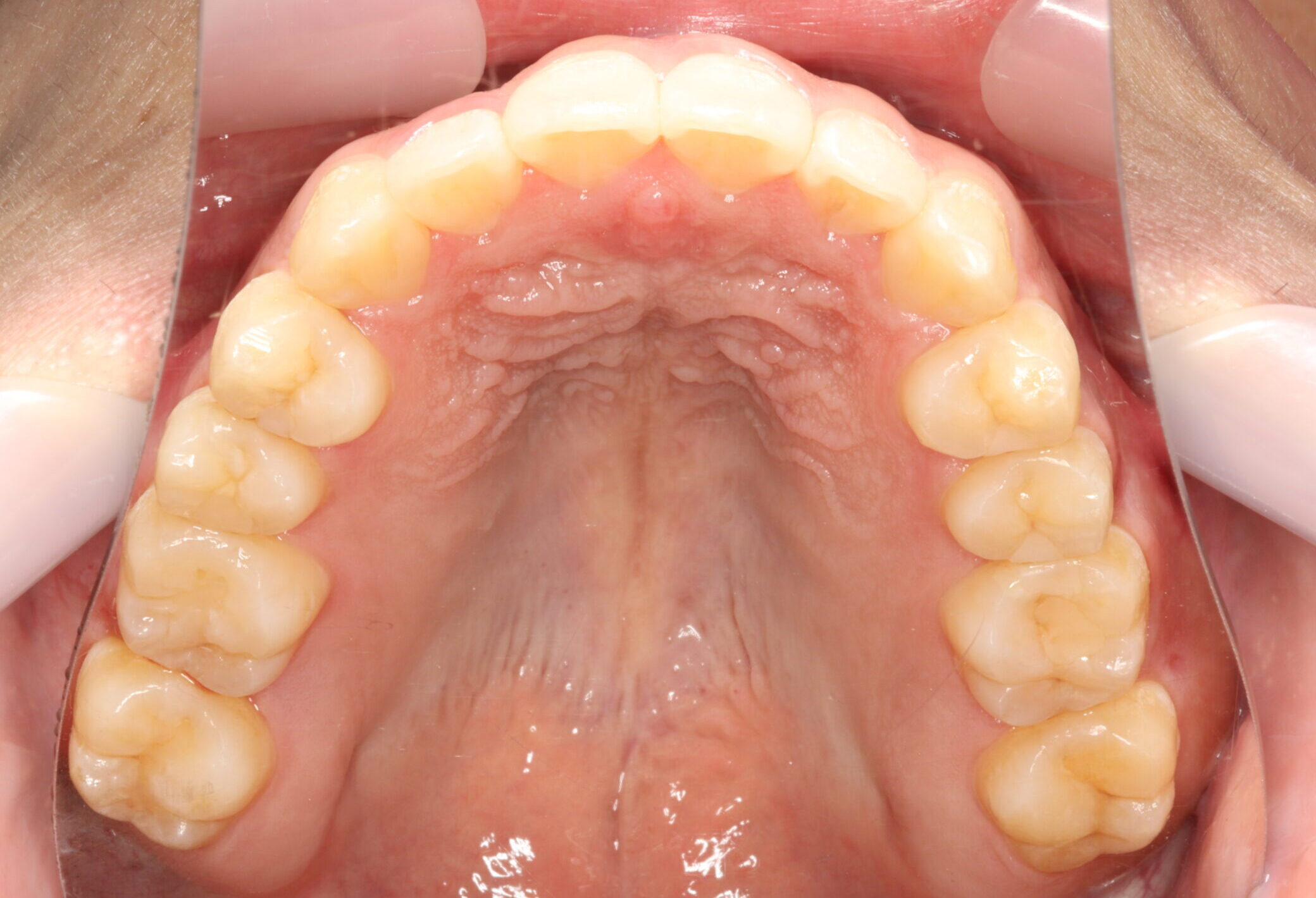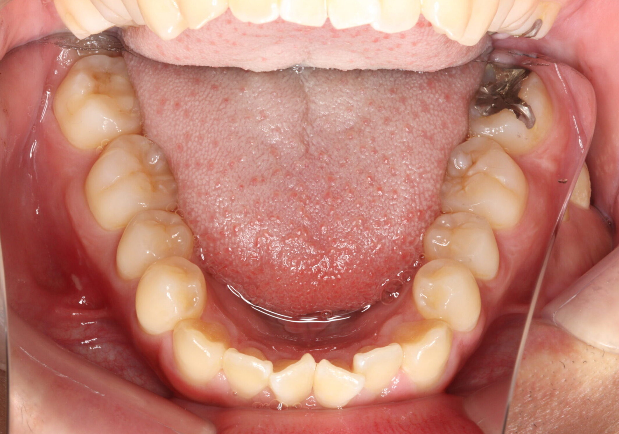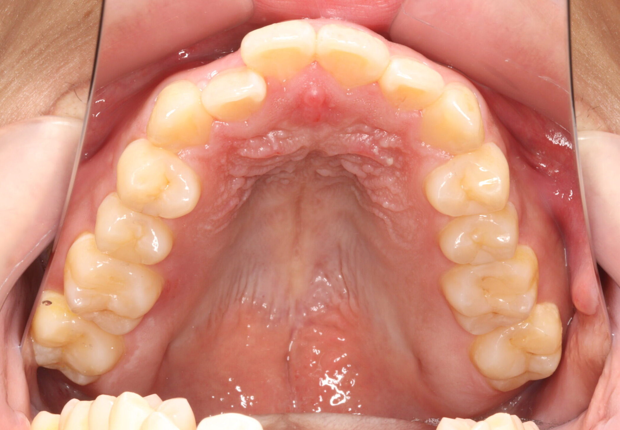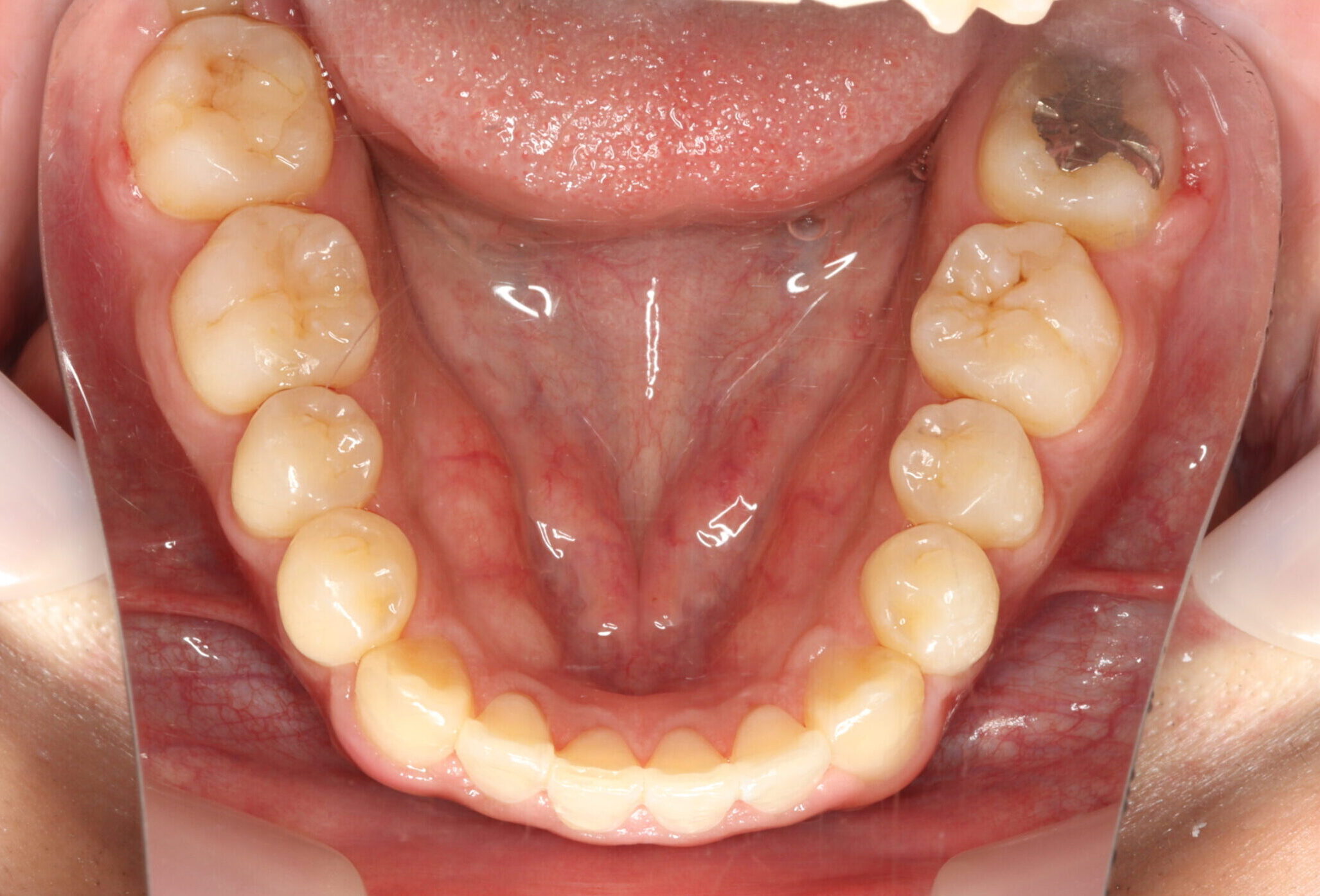 【治療方法】マルチブラケット装置にて排列を行う。咬合の確立のため顎間ゴムを併用し、舌突出癖の改善のため筋機能療法を行う
