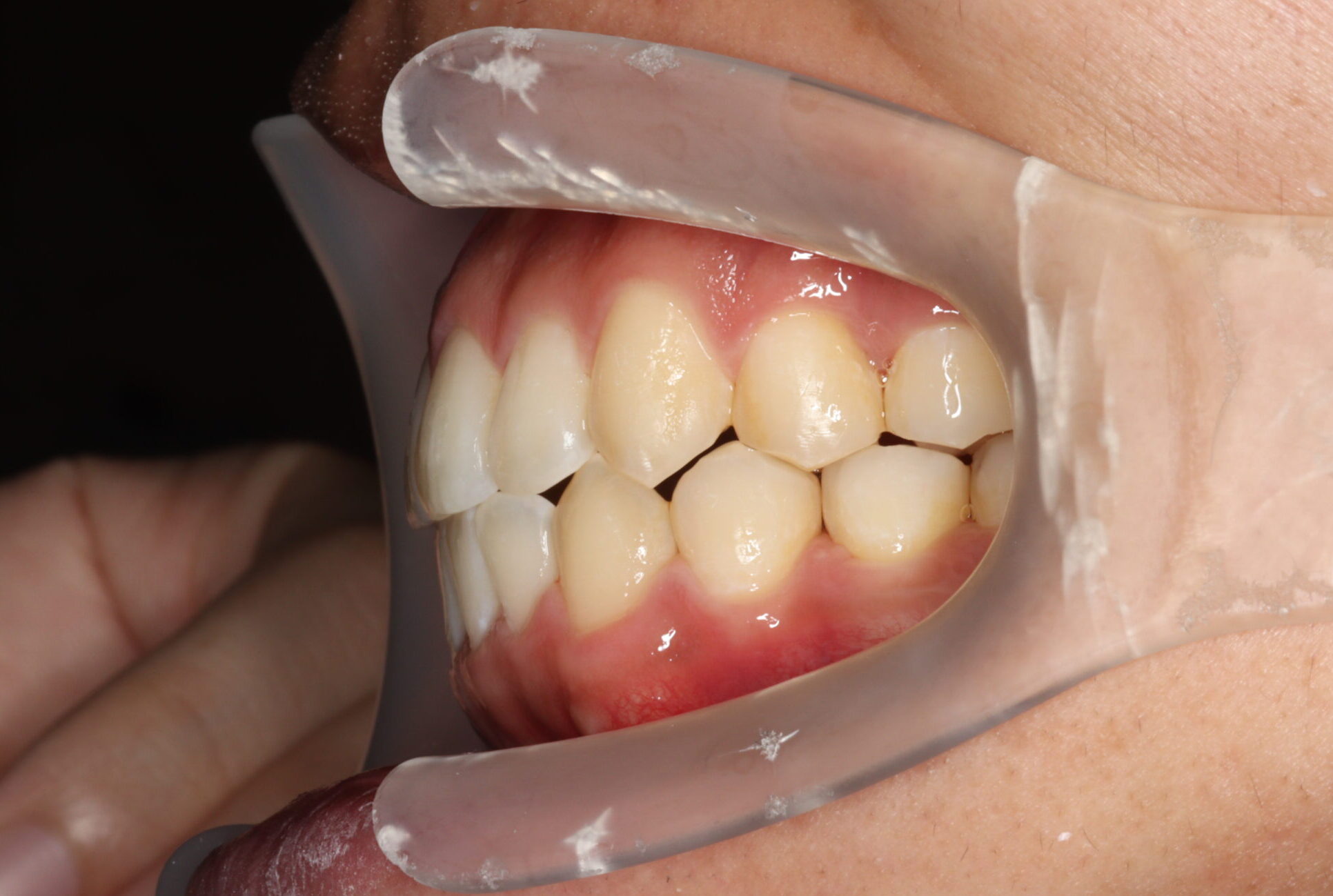 【診断】開咬、叢生(でこぼこ)、上下顎前歯唇側傾斜、舌突出癖